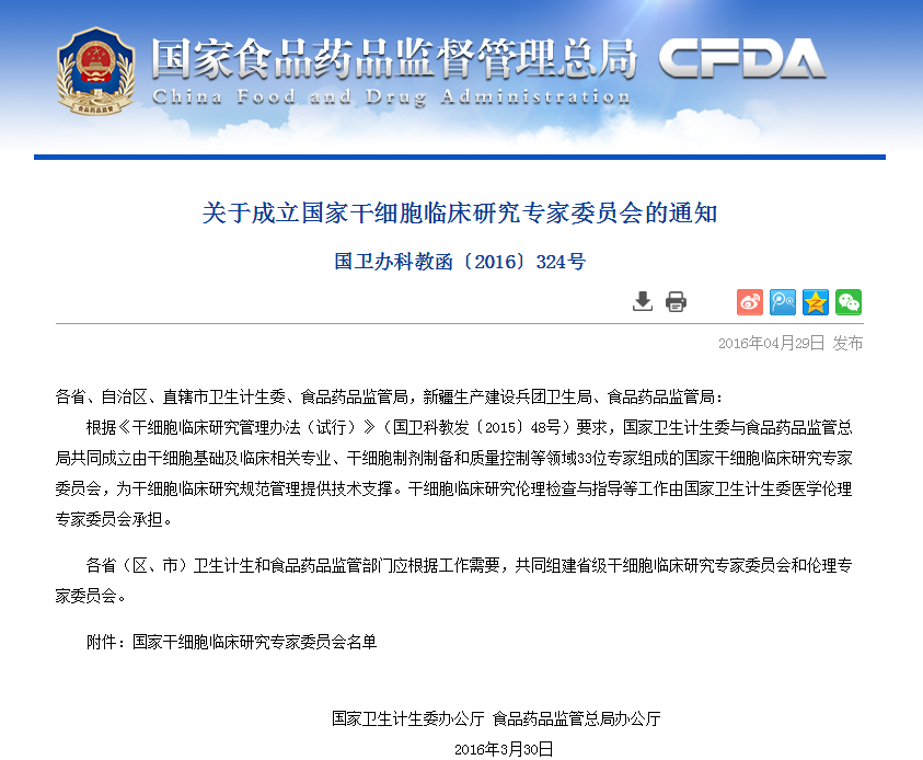 各省、自治區(qū)、直轄市衛(wèi)生計生委、食品藥品監(jiān)管局,新疆生產(chǎn)建設兵團衛(wèi)生局、食品藥品監(jiān)管局: 根據(jù)《干細胞臨床研究管理辦法(試行)》(國衛(wèi)科教發(fā)〔2015〕48號)要求,國家衛(wèi)生計生委與食品藥品監(jiān)管總局共同成立由干細胞基礎及臨床相關專業(yè)、干細胞制劑…